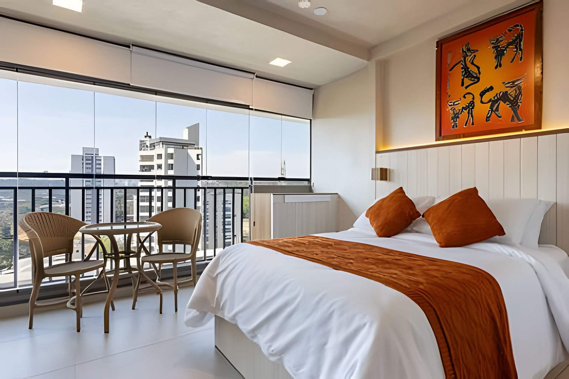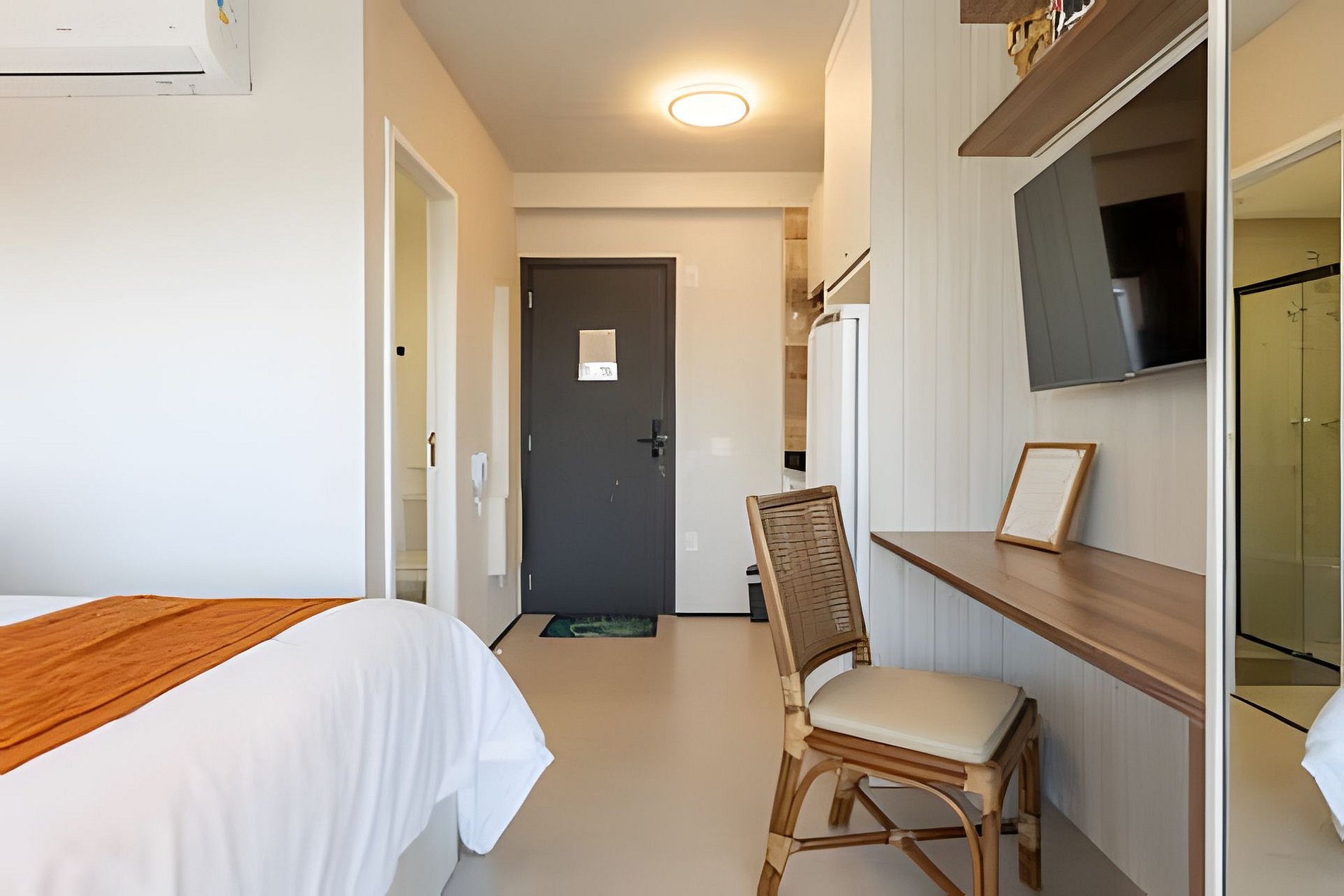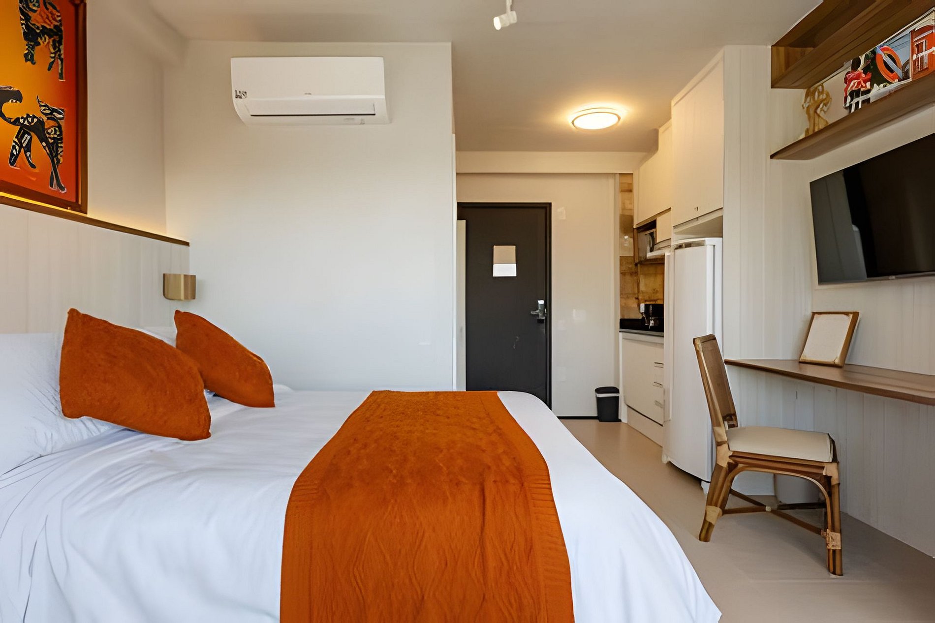 O quarto acomoda até 3 hóspedes, com uma cama de casal aconchegante e um colchão que garante conforto extra. O ambiente foi pensado nos mínimos detalhes para oferecer uma estadia agradável: ar-condicionado, Wi-Fi rápido e uma decoração clean que mistura funcionalidade e estilo.