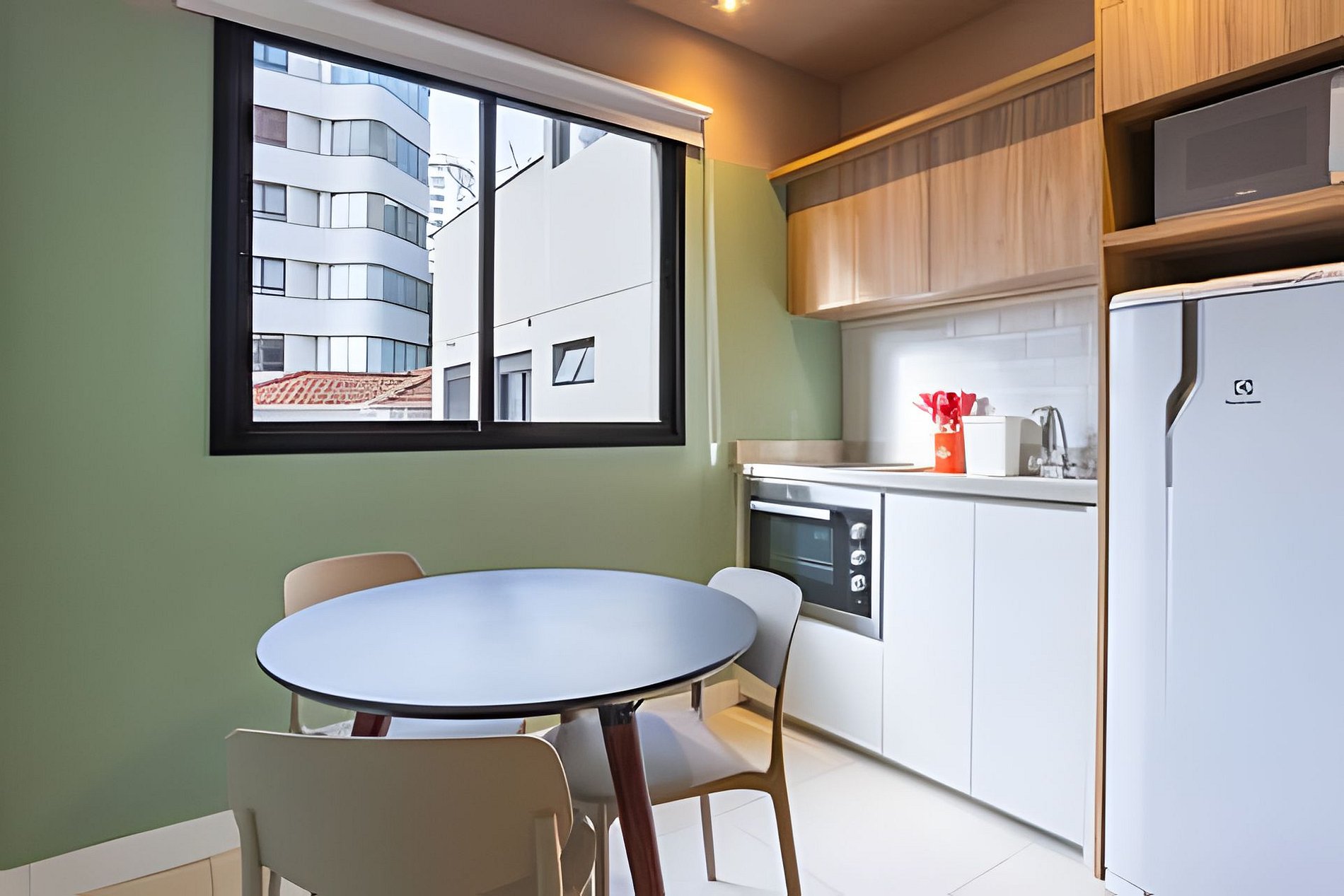 O estúdio foi recém reformado e está completo para sua estadia! - espaço integrado com quarto, sala e cozinha. Ar condicionado em todo espaço - banheiro completo - varanda - cama de casal e sofá cama - wifi rápido e estável - smarTV - cozinha completa - mesa e cadeira para home office - condomínio completo!