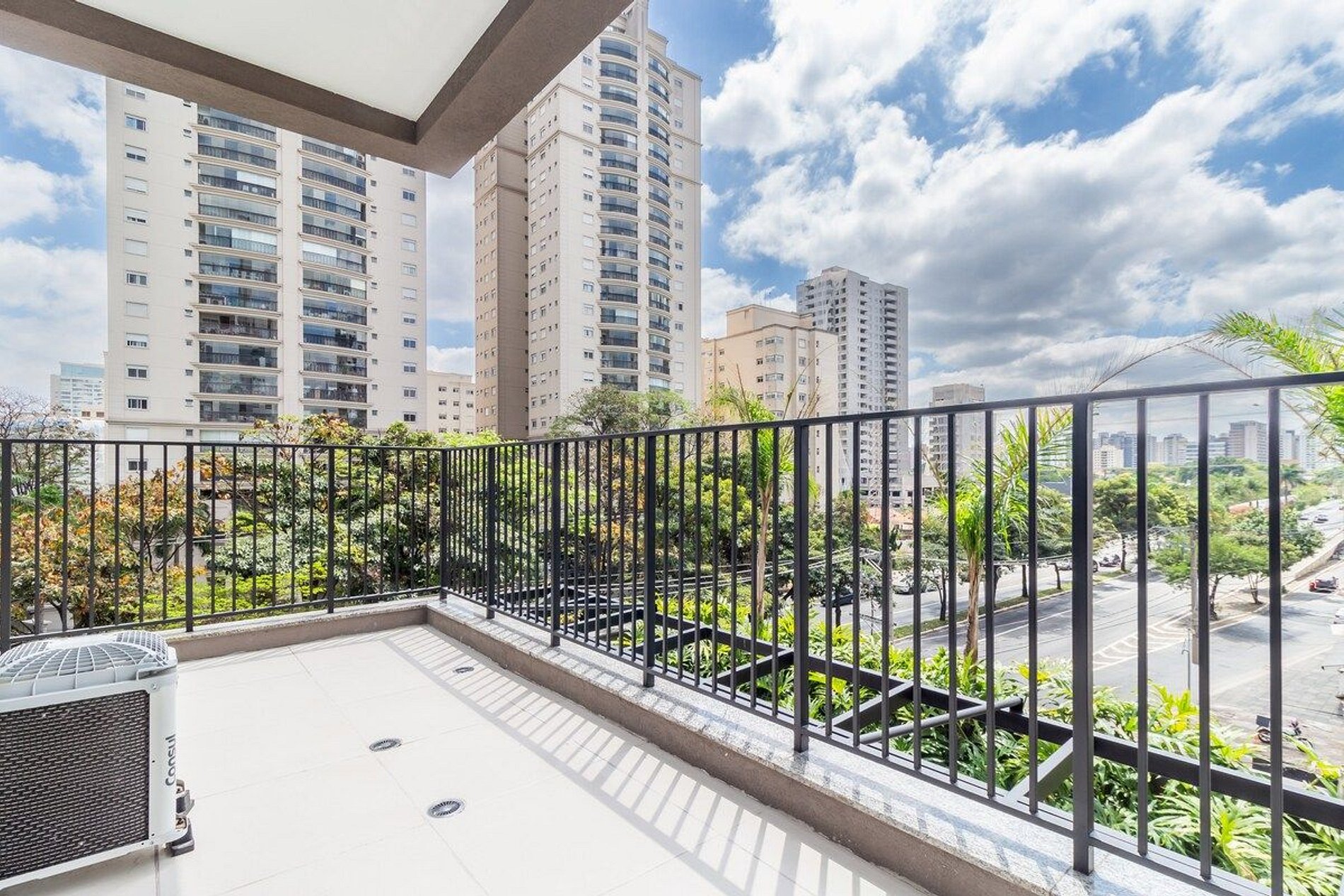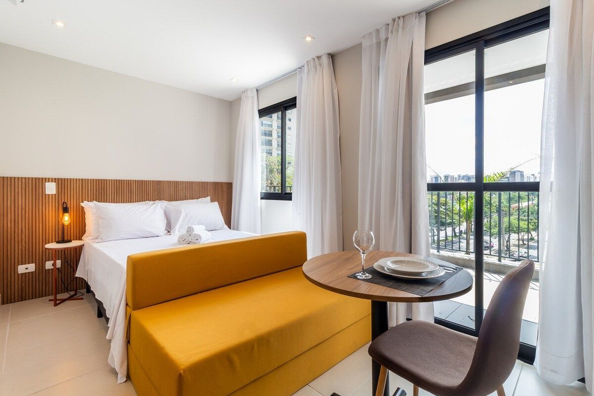 O estúdio foi recém reformado e está completo para sua estadia! - espaço integrado com quarto, sala e cozinha. Ar condicionado em todo espaço - banheiro completo - varanda com vista para a Av Ibirapuera - cama de casal e sofá cama - wifi rápido e estável - smarTV - cozinha completa - mesa e cadeira para home office - condomínio completo!