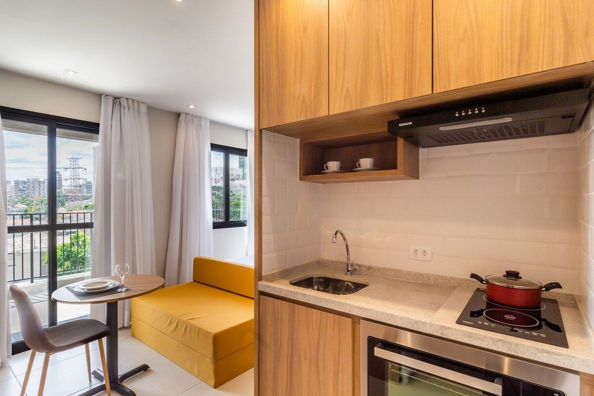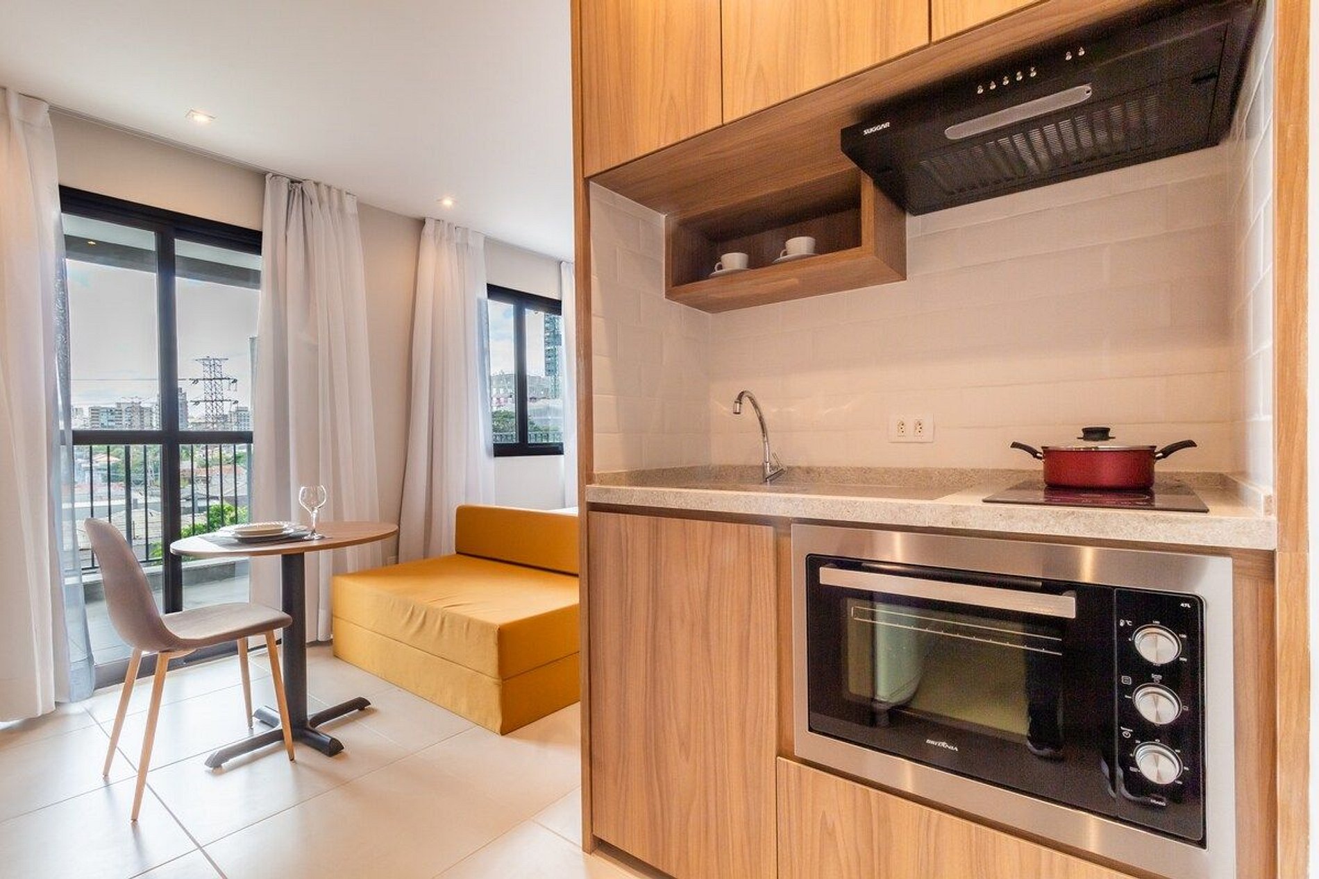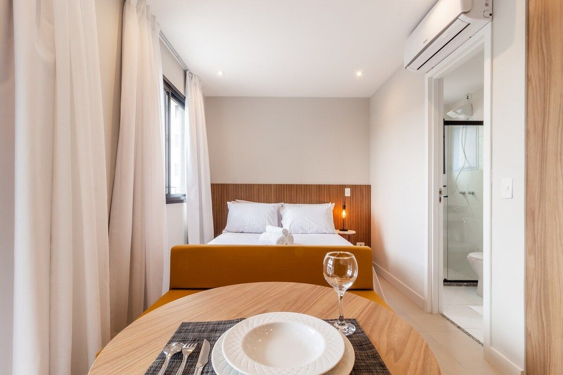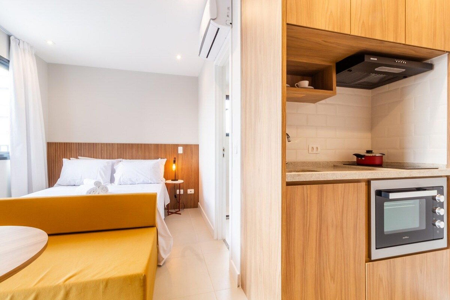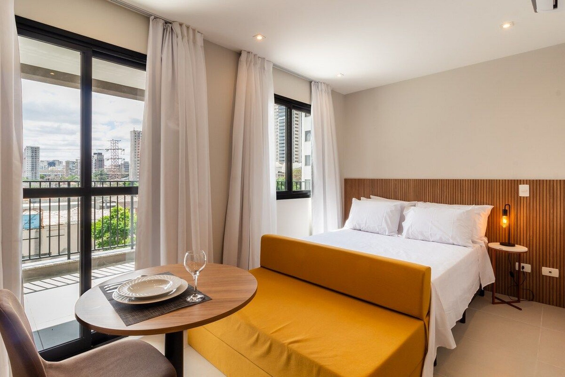 O estúdio foi recém reformado e está completo para sua estadia! - espaço integrado com quarto, sala e cozinha. Ar condicionado em todo espaço - banheiro completo - varanda com vista para a Av Ibirapuera - cama de casal e sofá cama - wifi rápido e estável - smarTV - cozinha completa - mesa e cadeira para home office - condomínio completo!