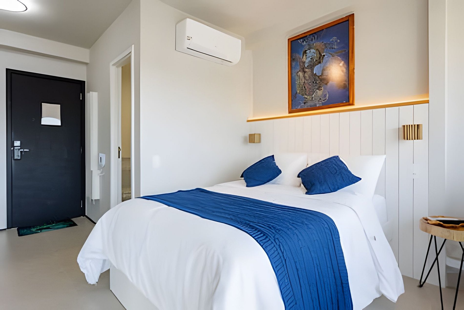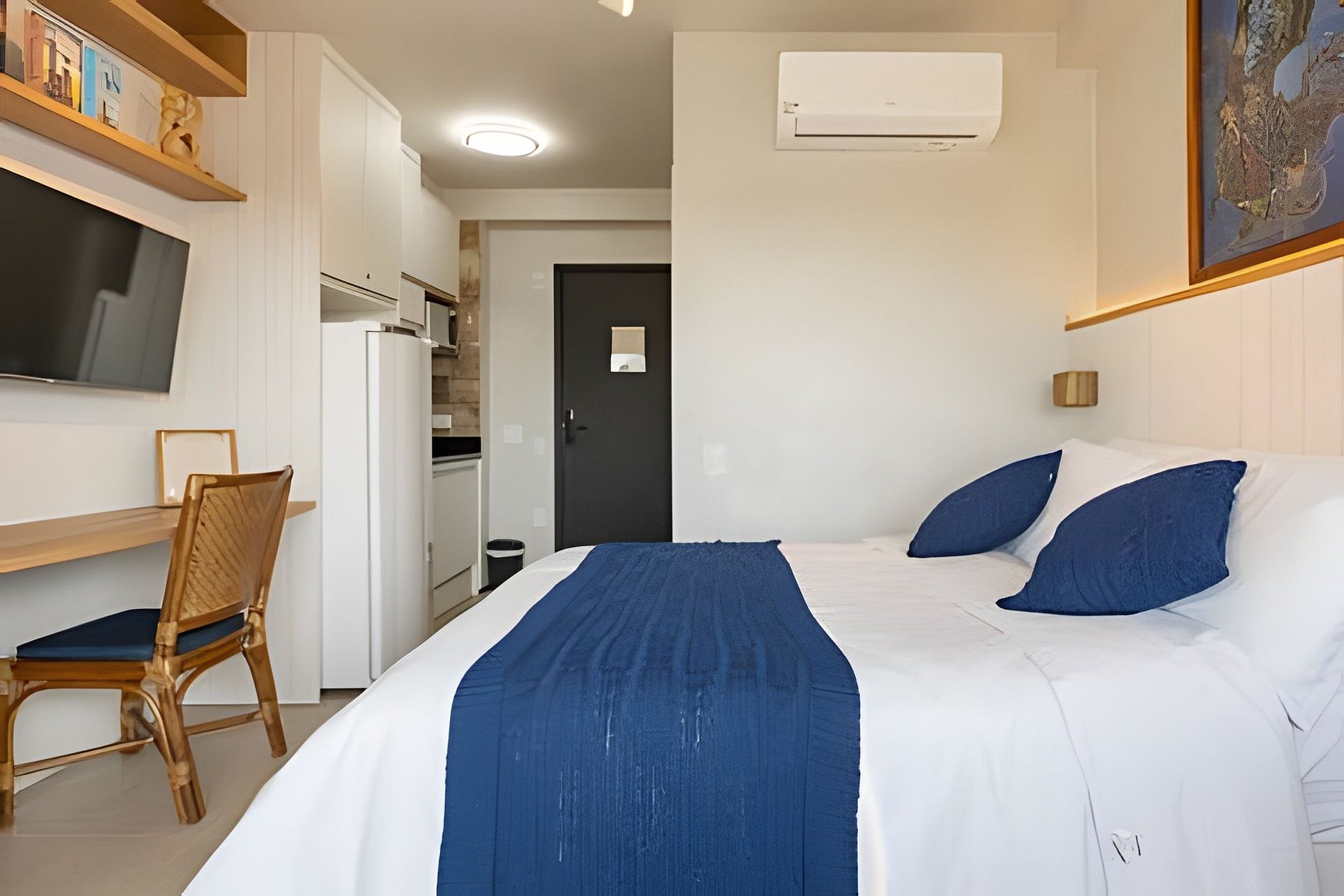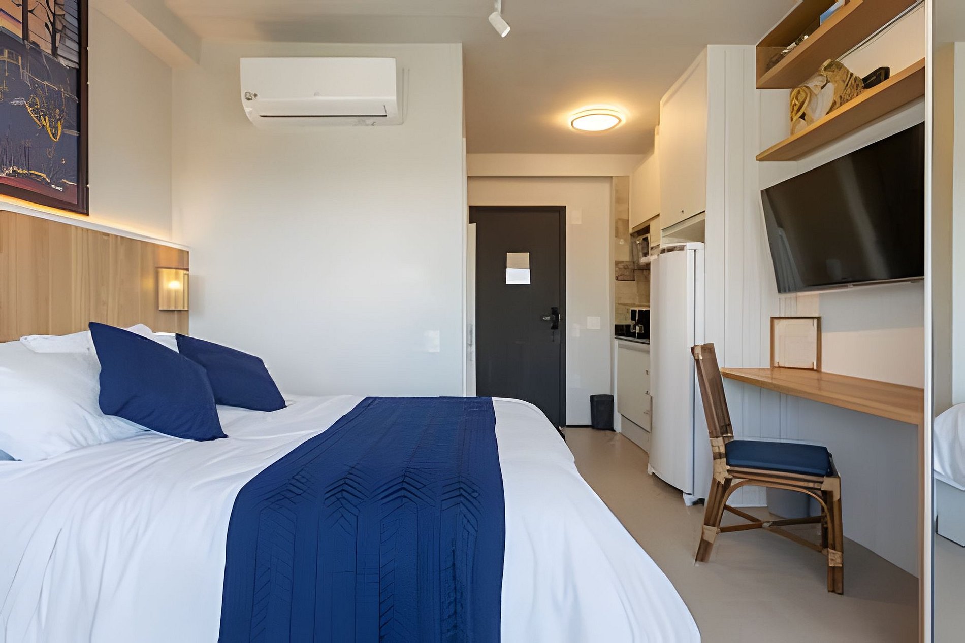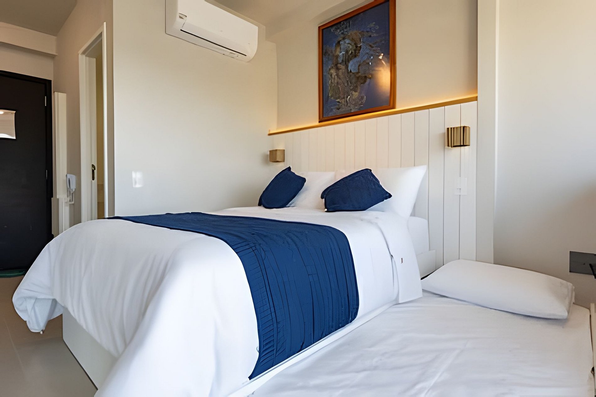 O quarto acomoda até 3 hóspedes, com uma cama de casal aconchegante e um colchão que garante conforto extra. O ambiente foi pensado nos mínimos detalhes para oferecer uma estadia agradável: ar-condicionado, Wi-Fi rápido e uma decoração clean que mistura funcionalidade e estilo.