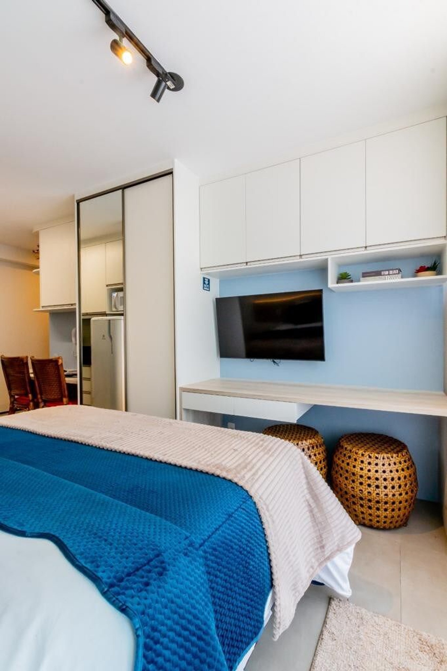 O estúdio é lindo! Muito bem decorado, com quarto, banheiro, cozinha e sacada integrados. Tudo muito novo e pensado especialmente para nossos hóspedes. Além disso, o condomínio tem apenas 6 meses, super moderno e completo! Conta com: - academia - espaço de coworking - lavanderia comunitária - jardim e espaço pet-friendly - portaria 24 horas