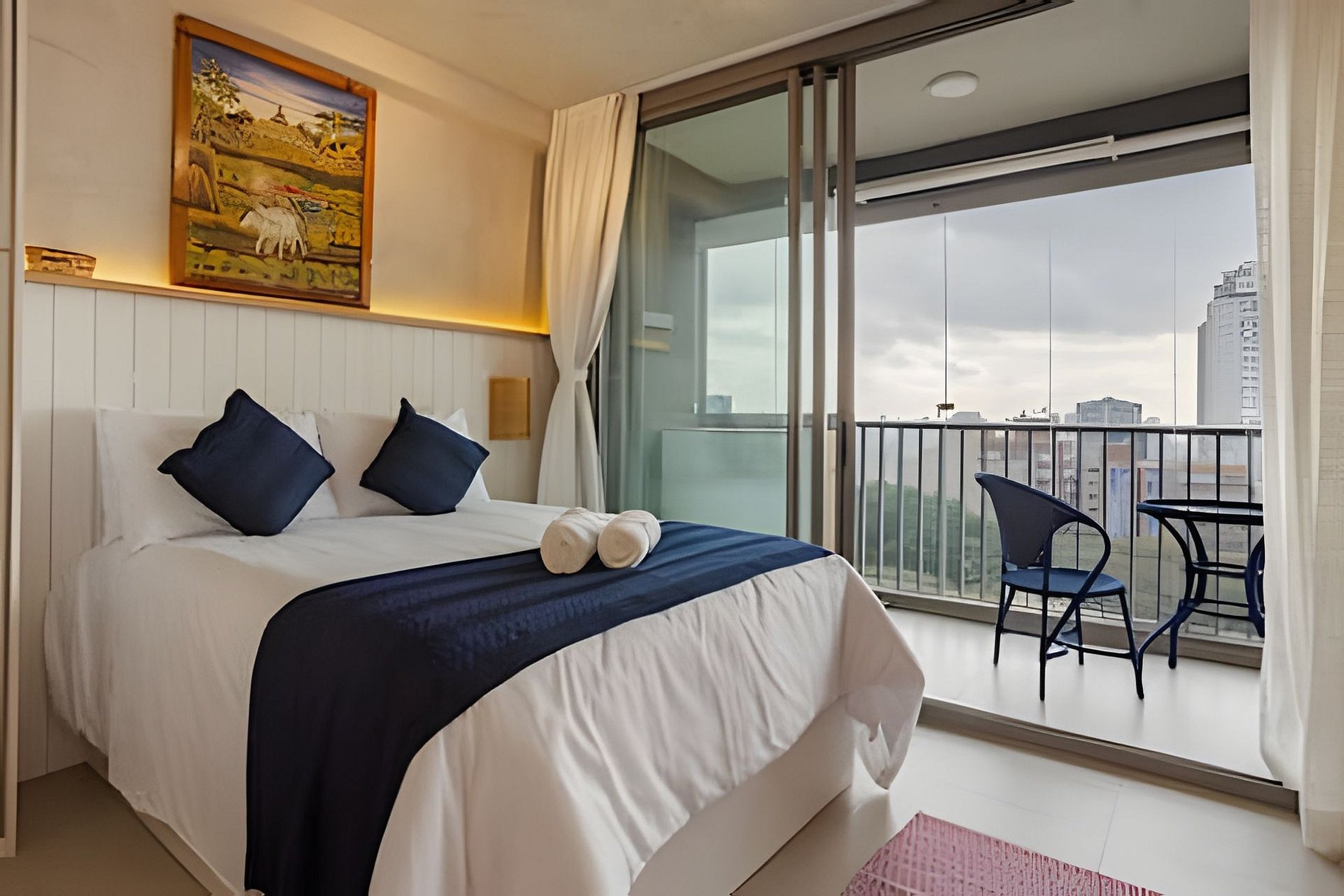 O estúdio é completo para sua estadia! - espaço integrado com quarto, sala e cozinha. Ar condicionado - banheiro completo - varanda - cama de casal e colchão de solteiro - wifi rápido e estável - condomínio completo!